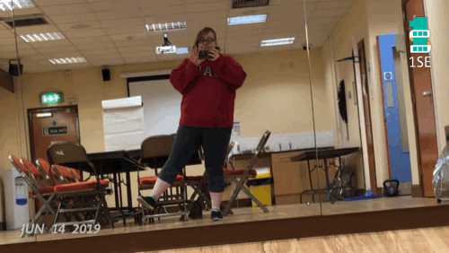 Gif description: I’ve arrived at my gym class early so I’m messing around with some very light warm-ups, raising one leg gently. I’m wearing workout clothes and a comfy hoodie.