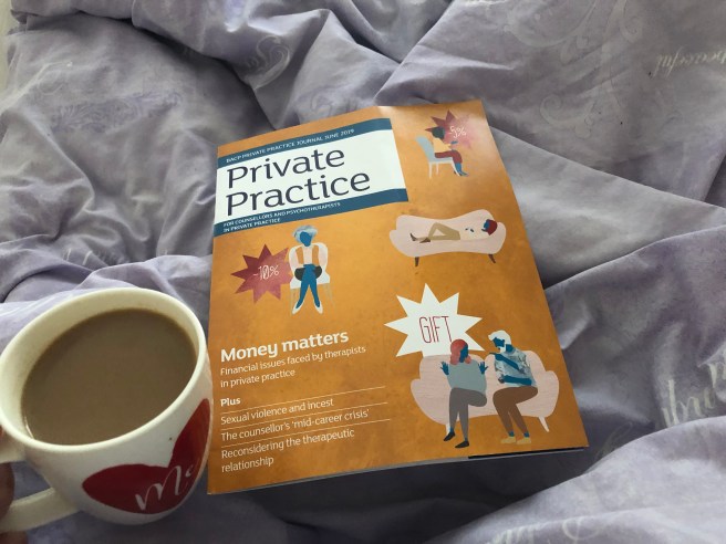 Picture description: A copy of ‘Private Practice’ magazine from the BACP is lying on a comfy duvet next to a mug full of coffee.