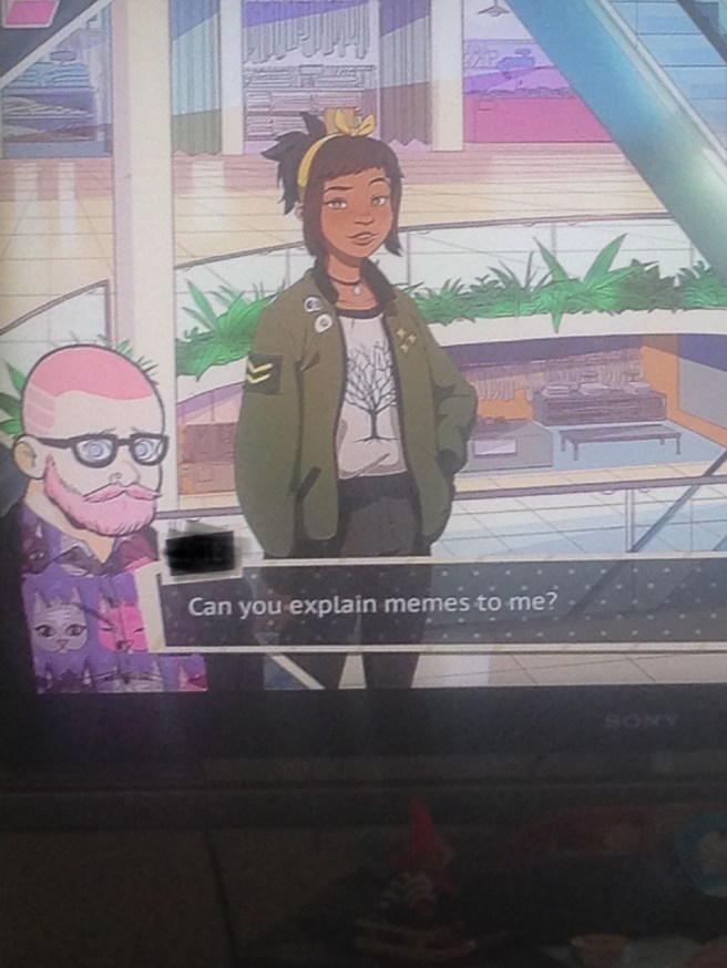Picture description: This is a photograph of me playing ‘Dream Daddy’. My personal daddy, a fat cutie with a pink beard and a purple cat shirt, is asking his daughter, Amanda, “Can you explain memes to me?”
