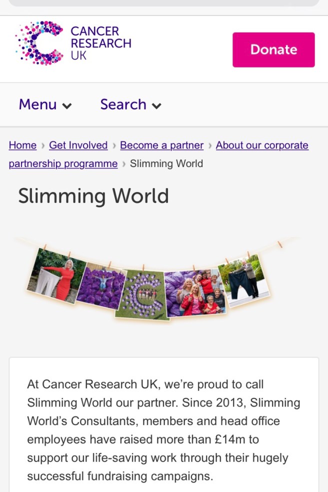 Image description: A screenshot from the Cancer Research UK website shows Slimming World as their ‘corporate partner’. The text notes that Cancer Research UK is ‘proud to call Slimming World our partner’ with ‘£14m’ donated to them by ‘Consultants, members and head office employees’.