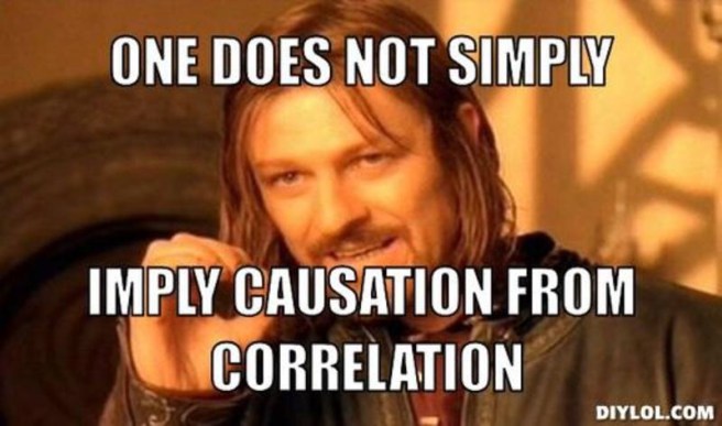 Image description: It’s the classic meme format of Sean Bean as Boromir. This time, he’s saying ‘One does not simply imply causation from correlation.’
