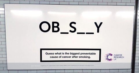 Image description: Cancer Research UK’s anti-fat advert from last year, shown here in a subway station. It reads ‘OB_S__Y – Guess what is the biggest preventable cause of cancer after smoking.’