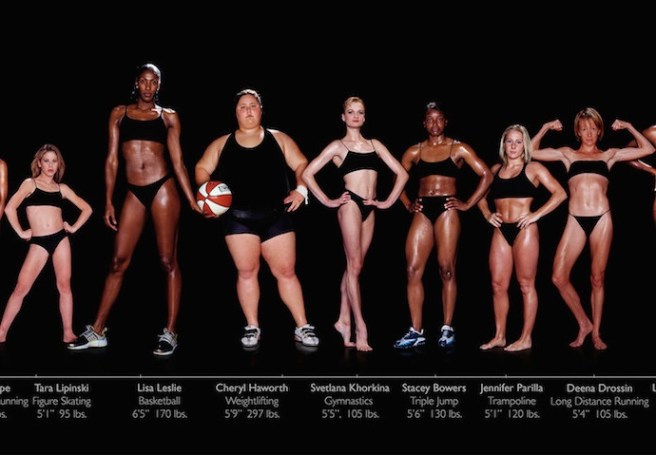 Image description: Several Olympic athletes are stood next to each other in athletic poses. They are a range of body sizes from fat to thin.