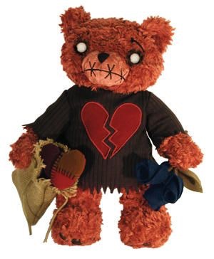 Image description: Edwin Morose, a goth teddy bear made by Teddy Scares, looks out lovingly with his blank eyes and stitched-up mouth. He’s holding a plush dead rose and his own patchwork heart. Despite his spookiness, he is every cute.