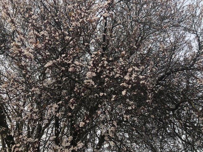 Image description: A tree with no leaves is starting to bud again, producing some tiny white and pink flowers. The sky behind the tree is a very pale grey.