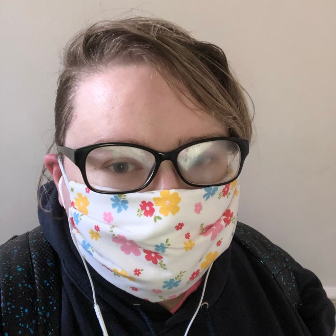 Image description: I, a non-binary person with a grown-out undercut and steamed-up glasses, am looking directly at the camera while wearing a floral face mask. Part of my outfit is visible – I’m wearing dark blue hoodie and a sparkly dark blue backpack. This is basically what I have looked like through lockdown.
