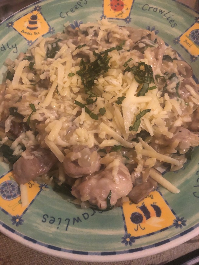 Image description: Creamy chicken and mushroom orzo sprinkled with cheddar and chives. It did not look this grey in real life!