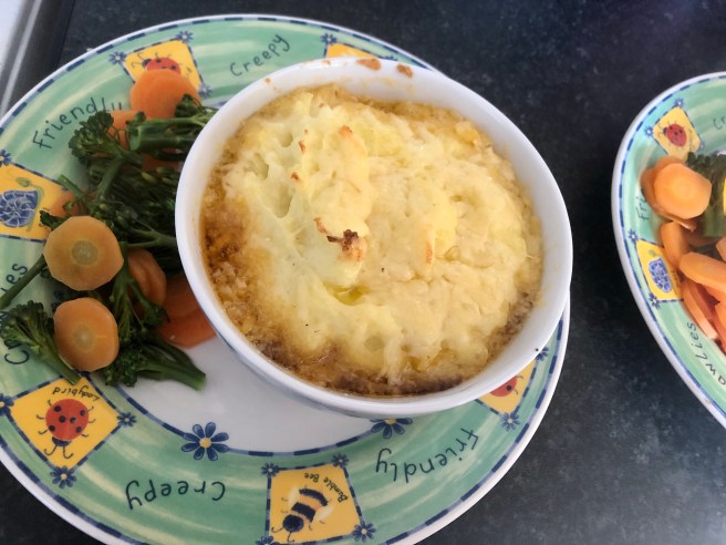 Image description: Cheese-topped cottage pie with carrots and broccoli on the side.