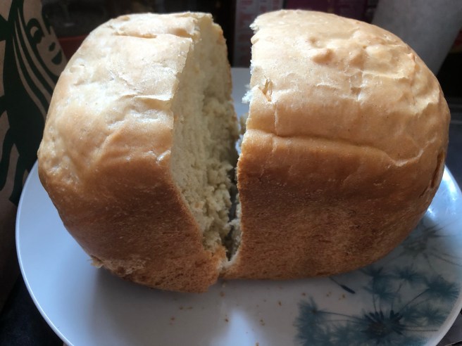 Image description: A small freshly baked loaf of white bread with a light crust.