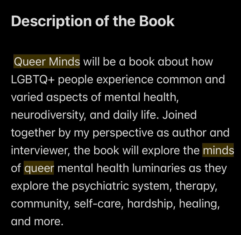 The potential full title is currently Queer Minds: LGBTQ+ Luninaries on Mental Health, Neurodiversity, and the Things that Help, but I’m still workshopping this as I go. Any ideas for a great title?